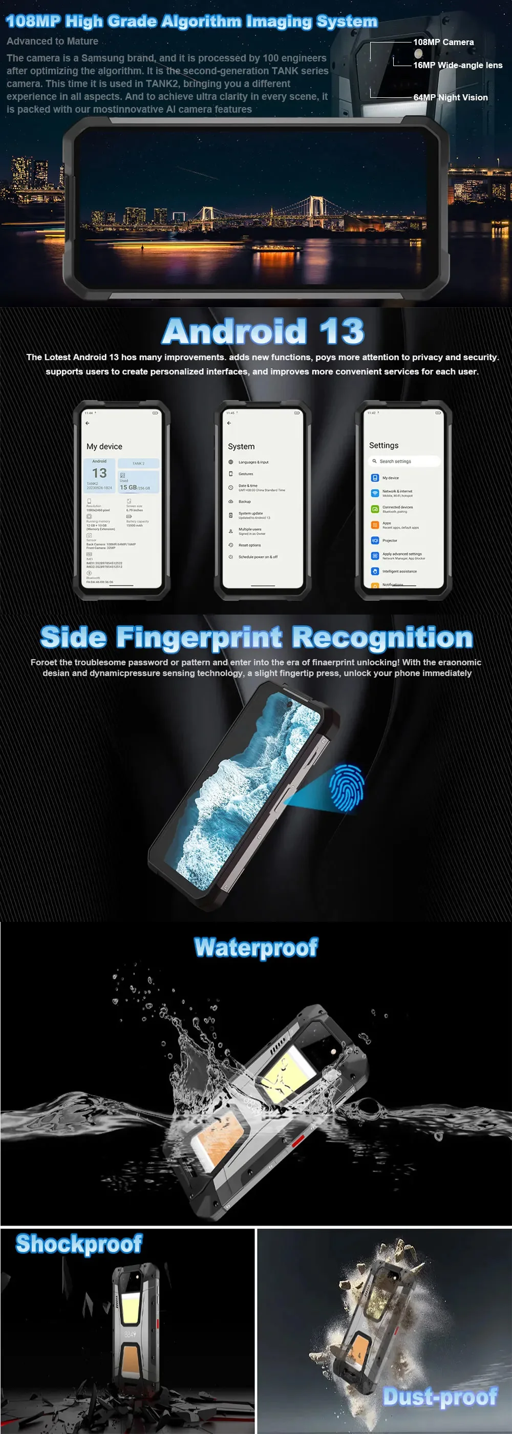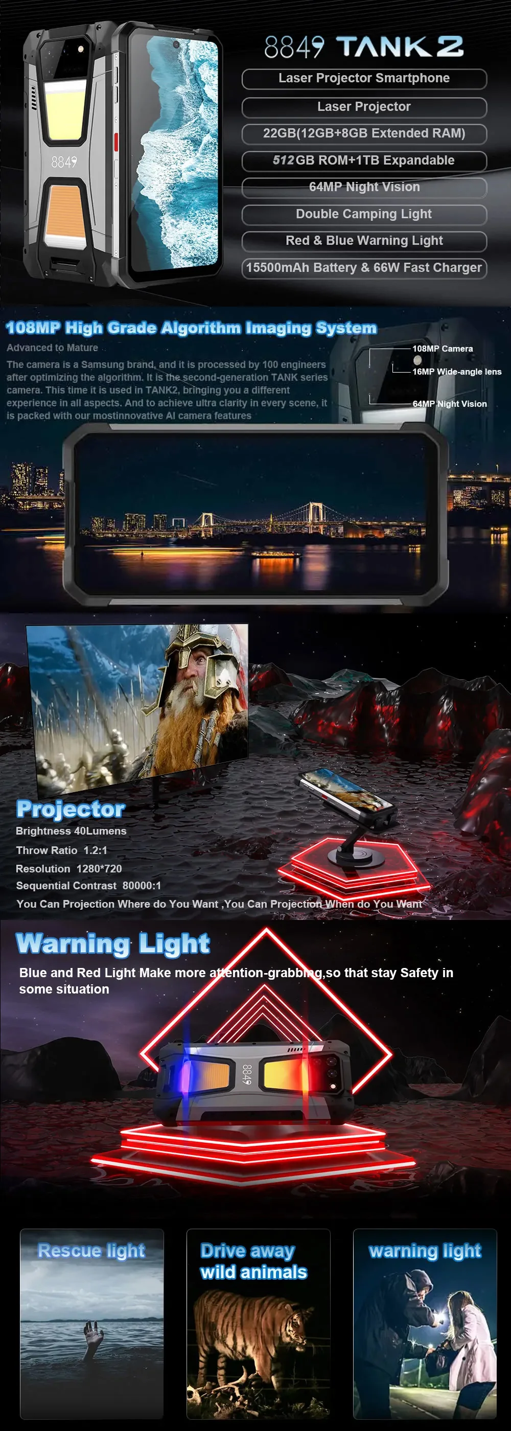 Unihertz 8849 Tank 2 Projector,22GB+512GB,108MP Camera Night Version,Helio G99,NFC,15500mAh,6.79" FHD+Display,Global Version